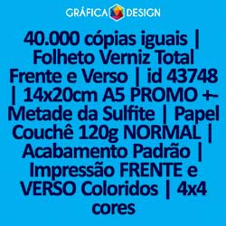 40.000 cópias iguais | Folheto Verniz Total Frente e Verso | id 43748 | 14x20cm A5 PROMO +-Metade da Sulfite | Papel Couchê 120g NORMAL | Impressão FRENTE e VERSO Coloridos | 4x4 cores