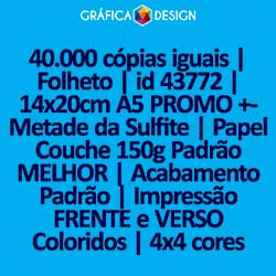 40.000 cópias iguais | Folheto | id 43772 | 14x20cm A5 PROMO +-Metade da Sulfite | Papel Couchê 150g Padrão MELHOR | Impressão FRENTE e VERSO Coloridos | 4x4 cores