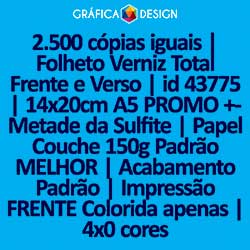 2.500 cópias iguais | Folheto Verniz Total Frente e Verso | id 43775 | 14x20cm A5 PROMO +-Metade da Sulfite | Papel Couchê 150g Padrão MELHOR | Impressão FRENTE Colorida apenas | 4x0 cores