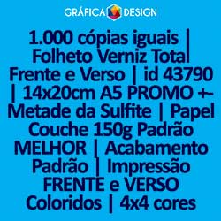 1.000 cópias iguais | Folheto Verniz Total Frente e Verso | id 43790 | 14x20cm A5 PROMO +-Metade da Sulfite | Papel Couchê 150g Padrão MELHOR | Impressão FRENTE e VERSO Coloridos | 4x4 cores