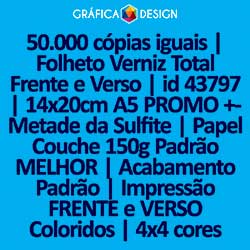 50.000 cópias iguais | Folheto Verniz Total Frente e Verso | id 43797 | 14x20cm A5 PROMO +-Metade da Sulfite | Papel Couchê 150g Padrão MELHOR | Impressão FRENTE e VERSO Coloridos | 4x4 cores