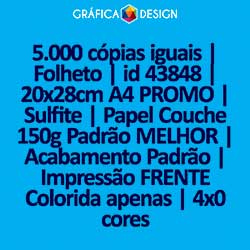 5.000 cópias iguais | Folheto | id 43848 | 20x28cm A4 PROMO | Sulfite | Papel Couchê 150g Padrão MELHOR | Impressão FRENTE Colorida apenas | 4x0 cores