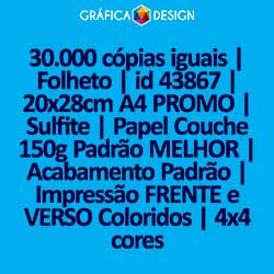 30.000 cópias iguais | Folheto | id 43867 | 20x28cm A4 PROMO | Sulfite | Papel Couchê 150g Padrão MELHOR | Impressão FRENTE e VERSO Coloridos | 4x4 cores