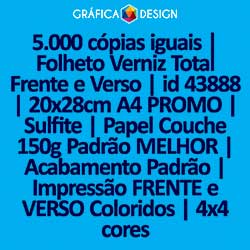 5.000 cópias iguais | Folheto Verniz Total Frente e Verso | id 43888 | 20x28cm A4 PROMO | Sulfite | Papel Couchê 150g Padrão MELHOR | Impressão FRENTE e VERSO Coloridos | 4x4 cores