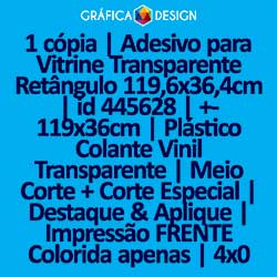 1 cópia | Adesivo para Vitrine Transparente Retângulo 119,6x36,4cm | id 445628 | +-119x36cm | Plástico Colante Vinil Transparente | Meio Corte + Corte Especial | Destaque & Aplique | Impressão FRENTE Colorida apenas | 4x0 cores