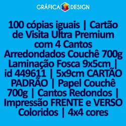 100 cópias iguais | Cartão de Visita Ultra Premium com 4 Cantos Arredondados Couchê 700g Laminação Fosca 9x5cm | id 449611 | 5x9cm CARTÃO PADRÃO | Papel Couchê 700g | Cantos Redondos | Impressão FRENTE e VERSO Coloridos | 4x4 cores