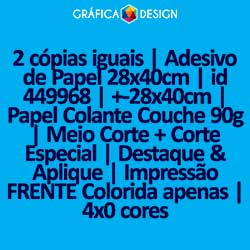 2 cópias iguais | Adesivo de Papel 28x40cm | id 449968 | +-28x40cm | Papel Colante Couchê 90g | Meio Corte + Corte Especial | Destaque & Aplique | Impressão FRENTE Colorida apenas | 4x0 cores