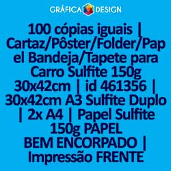 100 cópias iguais | Cartaz/Pôster/Folder/Papel Bandeja/Tapete para Carro Sulfite 150g 30x42cm | id 461356 | 30x42cm A3 Sulfite Duplo | 2x A4 | Papel Sulfite 150g PAPEL BEM ENCORPADO | Impressão FRENTE Colorida apenas | 4x0 cores