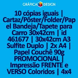 10 cópias iguais | Cartaz/Pôster/Folder/Papel Bandeja/Tapete para Carro 30x42cm | id 461677 | 30x42cm A3 Sulfite Duplo | 2x A4 | Papel Couchê 90g PROMOCIONAL | Impressão FRENTE e VERSO Coloridos | 4x4 cores
