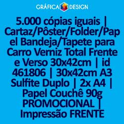 5.000 cópias iguais | Cartaz/Pôster/Folder/Papel Bandeja/Tapete para Carro Verniz Total Frente e Verso 30x42cm | id 461806 | 30x42cm A3 Sulfite Duplo | 2x A4 | Papel Couchê 90g PROMOCIONAL | Impressão FRENTE Colorida apenas | 4x0 cores