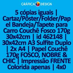 5 cópias iguais | Cartaz/Pôster/Folder/Papel Bandeja/Tapete para Carro Couchê Fosco 170g 30x42cm | id 462148 | 30x42cm A3 Sulfite Duplo | 2x A4 | Papel Couchê 170g FOSCO, NOBRE & CHIC | Impressão FRENTE Colorida apenas | 4x0 cores