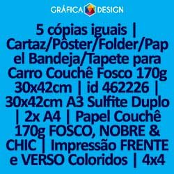 5 cópias iguais | Cartaz/Pôster/Folder/Papel Bandeja/Tapete para Carro Couchê Fosco 170g 30x42cm | id 462226 | 30x42cm A3 Sulfite Duplo | 2x A4 | Papel Couchê 170g FOSCO, NOBRE & CHIC | Impressão FRENTE e VERSO Coloridos | 4x4 cores