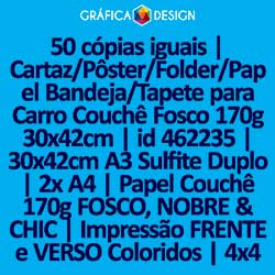 E-mail LUIZ@GRAFICA.DESIGN50 cópias iguais | Cartaz/Pôster/Folder/Papel Bandeja/Tapete para Carro Couchê Fosco 170g 30x42cm | id 462235 | 30x42cm A3 Sulfite Duplo | 2x A4 | Papel Couchê 170g FOSCO, NOBRE & CHIC | Impressão FRENTE e VERSO Coloridos | 4x4 cores
