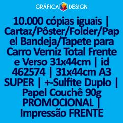 10.000 cópias iguais | Cartaz/Pôster/Folder/Papel Bandeja/Tapete para Carro Verniz Total Frente e Verso 31x44cm | id 462574 | 31x44cm A3 SUPER | +-Sulfite Duplo | Papel Couchê 90g PROMOCIONAL | Impressão FRENTE Colorida apenas | 4x0 cores