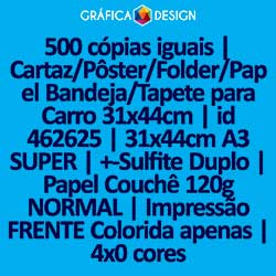 500 cópias iguais | Cartaz/Pôster/Folder/Papel Bandeja/Tapete para Carro 31x44cm | id 462625 | 31x44cm A3 SUPER | +-Sulfite Duplo | Papel Couchê 120g NORMAL | Impressão FRENTE Colorida apenas | 4x0 cores