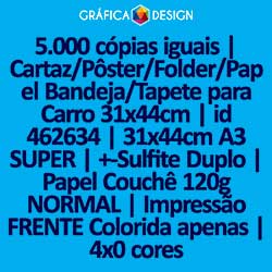 5.000 cópias iguais | Cartaz/Pôster/Folder/Papel Bandeja/Tapete para Carro 31x44cm | id 462634 | 31x44cm A3 SUPER | +-Sulfite Duplo | Papel Couchê 120g NORMAL | Impressão FRENTE Colorida apenas | 4x0 cores