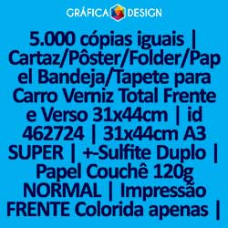 E-mail LUIZ@GRAFICA.DESIGN5.000 cópias iguais | Cartaz/Pôster/Folder/Papel Bandeja/Tapete para Carro Verniz Total Frente e Verso 31x44cm | id 462724 | 31x44cm A3 SUPER | +-Sulfite Duplo | Papel Couchê 120g NORMAL | Impressão FRENTE Colorida apenas | 4x0 cores
