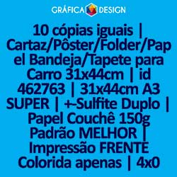10 cópias iguais | Cartaz/Pôster/Folder/Papel Bandeja/Tapete para Carro 31x44cm | id 462763 | 31x44cm A3 SUPER | +-Sulfite Duplo | Papel Couchê 150g Padrão MELHOR | Impressão FRENTE Colorida apenas | 4x0 cores