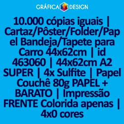 E-mail LUIZ@GRAFICA.DESIGN10.000 cópias iguais | Cartaz/Pôster/Folder/Papel Bandeja/Tapete para Carro 44x62cm | id 463060 | 44x62cm A2 SUPER | 4x Sulfite | Papel Couchê 80g PAPEL + BARATO | Impressão FRENTE Colorida apenas | 4x0 cores