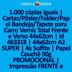 E-mail LUIZ@GRAFICA.DESIGN1.000 cópias iguais | Cartaz/Pôster/Folder/Papel Bandeja/Tapete para Carro Verniz Total Frente e Verso 44x62cm | id 463318 | 44x62cm A2 SUPER | 4x Sulfite | Papel Couchê 90g PROMOCIONAL | Impressão FRENTE e VERSO Coloridos | 4x4 cores