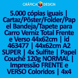 5.000 cópias iguais | Cartaz/Pôster/Folder/Papel Bandeja/Tapete para Carro Verniz Total Frente e Verso 44x62cm | id 463477 | 44x62cm A2 SUPER | 4x Sulfite | Papel Couchê 120g NORMAL | Impressão FRENTE e VERSO Coloridos | 4x4 cores