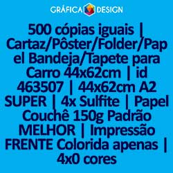 500 cópias iguais | Cartaz/Pôster/Folder/Papel Bandeja/Tapete para Carro 44x62cm | id 463507 | 44x62cm A2 SUPER | 4x Sulfite | Papel Couchê 150g Padrão MELHOR | Impressão FRENTE Colorida apenas | 4x0 cores