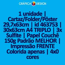 1 unidade | Cartaz/Folder/Pôster 29,7x63cm | id 463753 | 30x63cm A4 TRIPLO | 3x Sulfite | Papel Couchê 150g Padrão MELHOR | Impressão FRENTE Colorida apenas | 4x0 cores