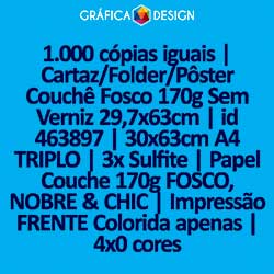 1.000 cópias iguais | Cartaz/Folder/Pôster Couchê Fosco 170g 29,7x63cm | id 463897 | 30x63cm A4 TRIPLO | 3x Sulfite | Papel Couchê 170g FOSCO, NOBRE & CHIC | Impressão FRENTE Colorida apenas | 4x0 cores