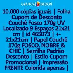 E-mail LUIZ@GRAFICA.DESIGN500 cópias iguais | Folha Cupom de Desconto Couchê Fosco 170g UV Localizado 15 Espaços 15x21 cm | id 465595 | 15x21cm A5 +-Metade da Sulfite | Papel Couchê 170g FOSCO, NOBRE & CHIC | Picote / Serrilha | Impressão FRENTE e VERSO Coloridos | 4x4 cores