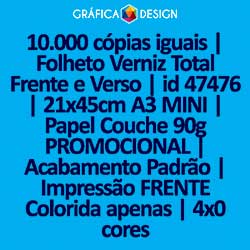 10.000 cópias iguais | Folheto Verniz Total Frente e Verso | id 47476 | 21x45cm A3 MINI | Papel Couchê 90g PROMOCIONAL | Impressão FRENTE Colorida apenas | 4x0 cores