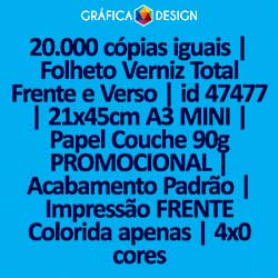 20.000 cópias iguais | Folheto Verniz Total Frente e Verso | id 47477 | 21x45cm A3 MINI | Papel Couchê 90g PROMOCIONAL | Impressão FRENTE Colorida apenas | 4x0 cores