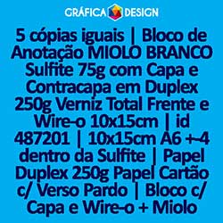 5 cópias iguais | Bloco de Anotação MIOLO BRANCO Sulfite 75g com Capa e Contracapa em Duplex 250g Verniz Total Frente e Wire-o 10x15cm | id 487201 | 10x15cm A6 +-4 dentro da Sulfite | Papel Duplex 250g Papel Cartão c/ Verso Pardo | Bloco c/ Capa e Wi