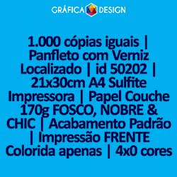 1.000 cópias iguais | Panfleto com Verniz Localizado | id 50202 | 21x30cm A4 Sulfite Impressora | Papel Couchê 170g FOSCO, NOBRE & CHIC | Impressão FRENTE Colorida apenas | 4x0 cores