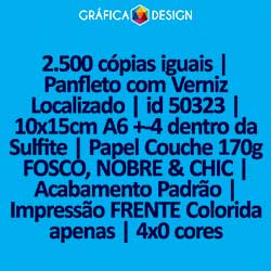 2.500 cópias iguais | Panfleto com Verniz Localizado | id 50323 | 10x15cm A6 +-4 dentro da Sulfite | Papel Couchê 170g FOSCO, NOBRE & CHIC | Impressão FRENTE Colorida apenas | 4x0 cores