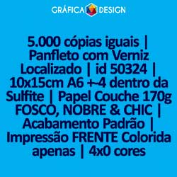 5.000 cópias iguais | Panfleto com Verniz Localizado | id 50324 | 10x15cm A6 +-4 dentro da Sulfite | Papel Couchê 170g FOSCO, NOBRE & CHIC | Impressão FRENTE Colorida apenas | 4x0 cores