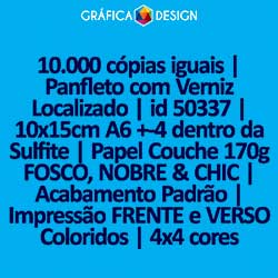 E-mail LUIZ@GRAFICA.DESIGN10.000 cópias iguais | Panfleto com Verniz Localizado | id 50337 | 10x15cm A6 +-4 dentro da Sulfite | Papel Couchê 170g FOSCO, NOBRE & CHIC | Impressão FRENTE e VERSO Coloridos | 4x4 cores
