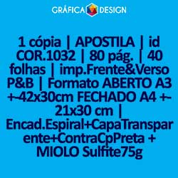 1 cópia | APOSTILA | id COR.1032 | 80 pág. | 40 folhas | imp.Frente&Verso COLORIDA | Formato ABERTO A3 +-42x30cm FECHADO A4 +-21x30 cm | Encad.Espiral+CapaTransparente+ContraCpPreta + MIOLO Sulfite75g
