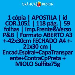 1 cópia | APOSTILA | id COR.1051 | 118 pág. | 59 folhas | imp.Frente&Verso COLORIDA | Formato ABERTO A3 +-42x30cm FECHADO A4 +-21x30 cm | Encad.Espiral+CapaTransparente+ContraCpPreta + MIOLO Sulfite75g