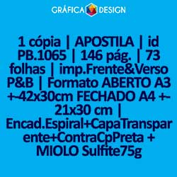 1 cópia | APOSTILA | id PB.1065 | 146 pág. | 73 folhas | imp.Frente&Verso P&B | Formato ABERTO A3 +-42x30cm FECHADO A4 +-21x30 cm | Encad.Espiral+CapaTransparente+ContraCpPreta + MIOLO Sulfite75g