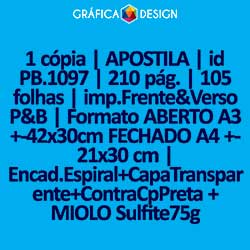 1 cópia | APOSTILA | id PB.1097 | 210 pág. | 105 folhas | imp.Frente&Verso P&B | Formato ABERTO A3 +-42x30cm FECHADO A4 +-21x30 cm | Encad.Espiral+CapaTransparente+ContraCpPreta + MIOLO Sulfite75g
