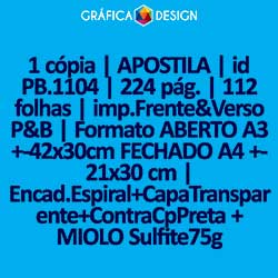 1 cópia | APOSTILA | id PB.1104 | 224 pág. | 112 folhas | imp.Frente&Verso P&B | Formato ABERTO A3 +-42x30cm FECHADO A4 +-21x30 cm | Encad.Espiral+CapaTransparente+ContraCpPreta + MIOLO Sulfite75g