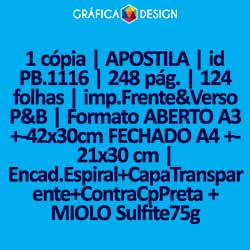 1 cópia | APOSTILA | id PB.1116 | 248 pág. | 124 folhas | imp.Frente&Verso P&B | Formato ABERTO A3 +-42x30cm FECHADO A4 +-21x30 cm | Encad.Espiral+CapaTransparente+ContraCpPreta + MIOLO Sulfite75g