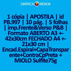 1 cópia | APOSTILA | id PB.997 | 10 pág. | 5 folhas | imp.Frente&Verso P&B | Formato ABERTO A3 +-42x30cm FECHADO A4 +-21x30 cm | Encad.Espiral+CapaTransparente+ContraCpPreta + MIOLO Sulfite75g