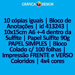 10 cópias iguais | Bloco de Anotações | id 413243 | 10x15cm A6 +-4 dentro da Sulfite | Papel Sulfite 90g PAPEL SIMPLES | Bloco Colado c/ 100 folhas | Impressão FRENTE e VERSO Coloridos | 4x4 cores
