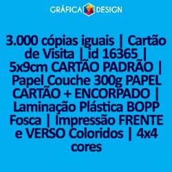 3.000 cópias iguais | Cartão de Visita | id 16365 | 5x9cm CARTÃO PADRÃO | Papel Couchê 300g PAPEL CARTÃO + ENCORPADO | Laminação Plástica BOPP Fosca | Impressão FRENTE e VERSO Coloridos | 4x4 cores