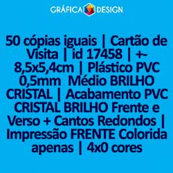 50 cópias iguais | Cartão de Visita | id 17458 | +-8,5x5,4cm | Plástico PVC 0,5mm Médio BRILHO CRISTAL | Acabamento PVC CRISTAL BRILHO Frente e Verso + Cantos Redondos | Impressão FRENTE Colorida apenas | 4x0 cores