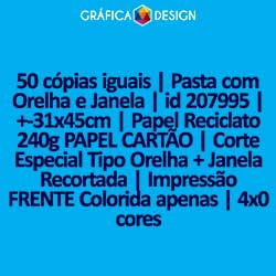 50 cópias iguais | Pasta com Orelha e Janela | id 207995 | +-31x45cm | Papel Reciclato 240g PAPEL CARTÃO | Corte Especial Tipo Orelha + Janela Recortada | Impressão FRENTE Colorida apenas | 4x0 cores