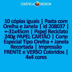 10 cópias iguais | Pasta com Orelha e Janela | id 208037 | +-31x45cm | Papel Reciclato 240g PAPEL CARTÃO | Corte Especial Tipo Orelha + Janela Recortada | Impressão FRENTE e VERSO Coloridos | 4x4 cores