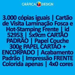 3.000 cópias iguais | Cartão de Visita Laminação Fosca e Hot-Stamping Frente | id 52953 | 5x9cm CARTÃO PADRÃO | Papel Couchê 300g PAPEL CARTÃO + ENCORPADO | Impressão FRENTE Colorida apenas | 4x0 cores