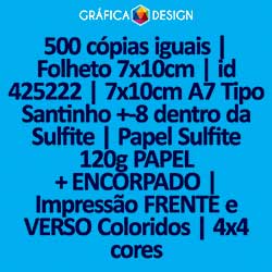 500 cópias iguais | Folheto 7x10cm | id 425222 | 7x10cm A7 Tipo Santinho +-8 dentro da Sulfite | Papel Sulfite 120g PAPEL + ENCORPADO | Impressão FRENTE e VERSO Coloridos | 4x4 cores